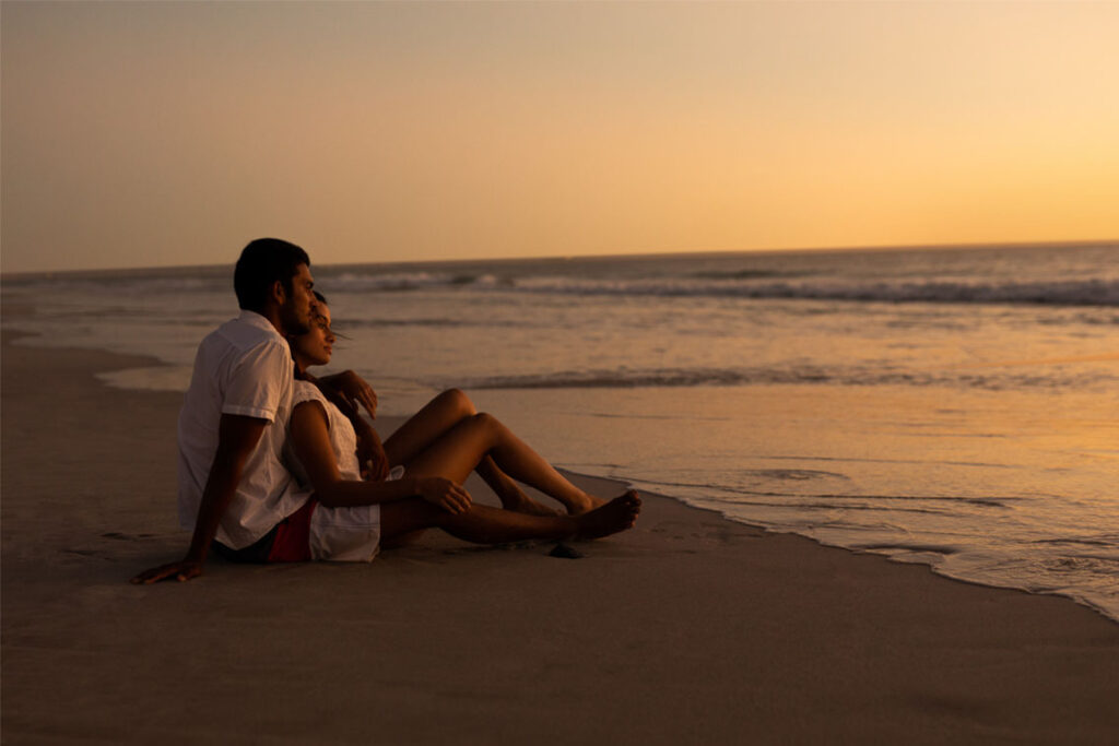 Os sons da natureza permeiam o ambiente, desde o canto dos pássaros ao amanhecer até o murmúrio das ondas ao entardecer, criando uma trilha sonora perfeita para o romance.