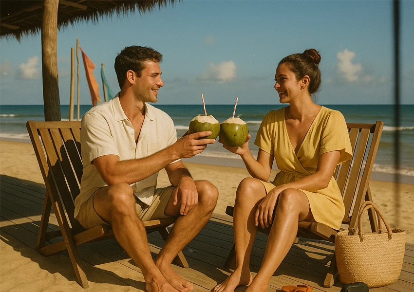 Mas o fator mais importante é a estabilidade climática. Durante outubro, Caraíva tem 92% de dias ensolarados, com variação de temperatura mínima e ventos constantes que mantêm o conforto térmico ideal. “É como ter ar condicionado natural funcionando 24 horas por dia”, Amanda descreve.